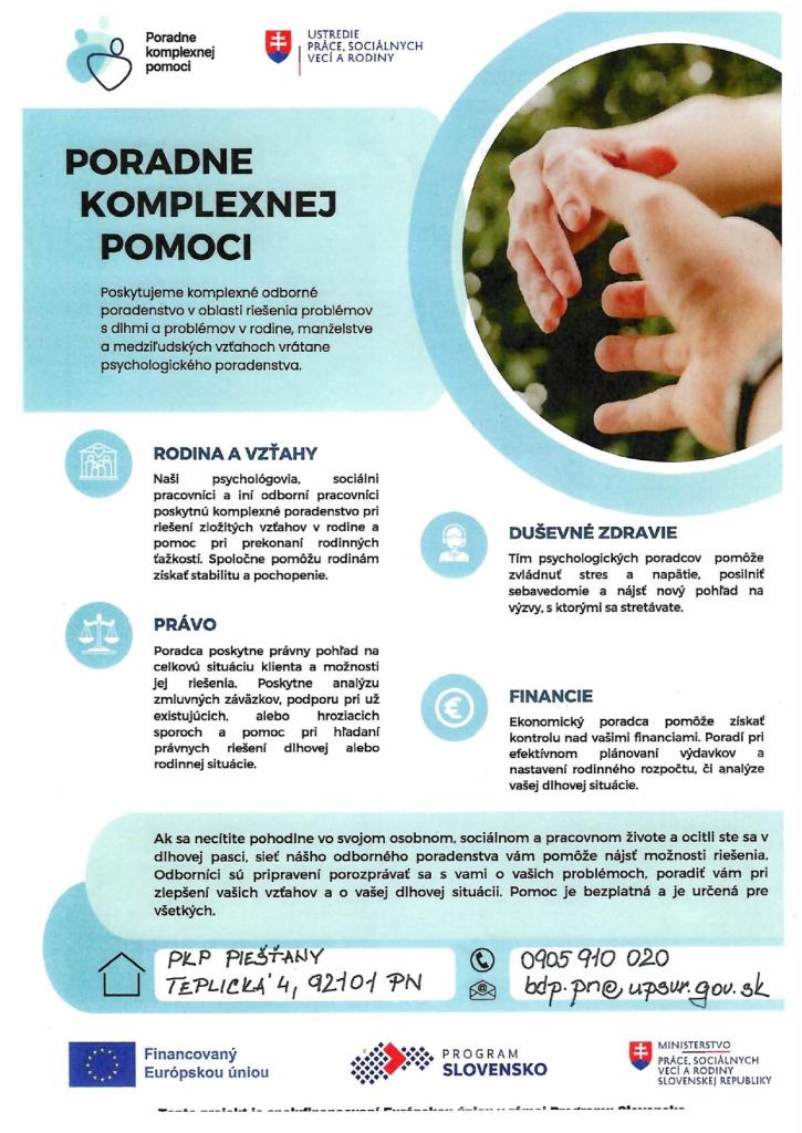Poradne komplexnej pomoci sú vytvorené s cieľom poskytnúť bezplatné odborné poradenstvo v oblasti riešenia dlhov, problémov v rodine, manželstve a medziľudských vzťahoch, a to aj so špecifickým zreteľom na rodiny s deťmi alebo osobami so zdravotným znevýhodnením na celom Slovensku.
